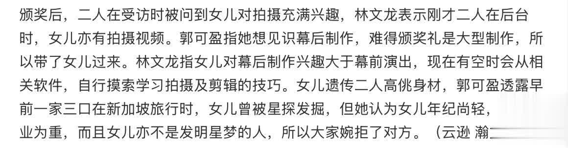 TVB在澳门举办《万千星辉颁奖典礼》,现场星光熠熠,除了现役TVB艺人悉数登场之外,TVB还邀请了很多已经离巢的小生、花旦维嘉优配,以颁奖人的身份现身,给大家制造惊喜,其中就有郭可盈、林文龙夫妇。两人以夫妻档的形式上台颁发“最佳女主角”,相信给场内外的观众都带来巨大的惊喜。而实际上夫妻俩当天还带上了15岁的女儿林天若一起出席颁奖礼,不过林天若没有在典礼后与父母一同接受访问,全程她都在后台,很低调。