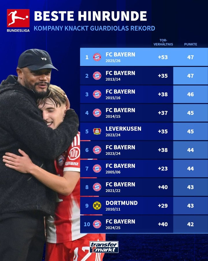 直播吧1月15日讯德转统计表明,孔帕尼带领拜仁上半赛季的成绩创造了德甲历史。