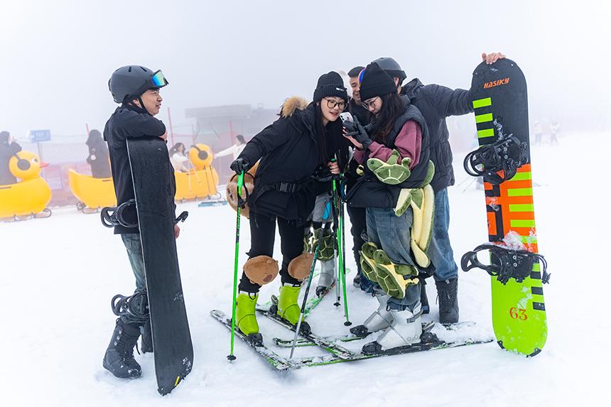 为了让游客有沉浸式互动体验,玉舍雪场利用森林景观,打造出梦幻的现实版“冰雪动物城”,由动物装扮的NPC演员带领游客参与游戏任务,赢取包含特色饮品和滑雪加时卡等奖励。与此同时,雪场专门开辟了“梭坡坡”怀旧冰雪乐园,还原贵州人记忆中的传统冰雪游戏,让各年龄段的游客都能在此重温简单纯粹的滑雪乐趣。