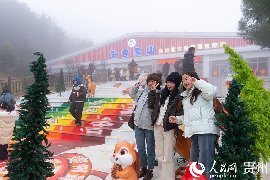 游客在六盘水玉舍雪山滑雪场入口打卡拍照。人民网记者 涂敏摄