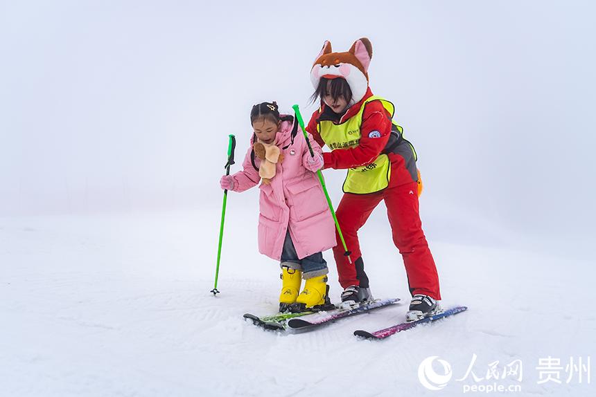 雪场内,教练教小朋友滑雪。人民网记者 涂敏摄