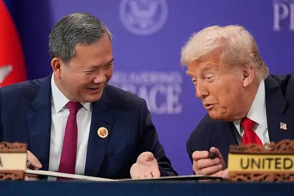 去年10月,特朗普与柬埔寨首相洪玛奈在签字仪式上交谈
